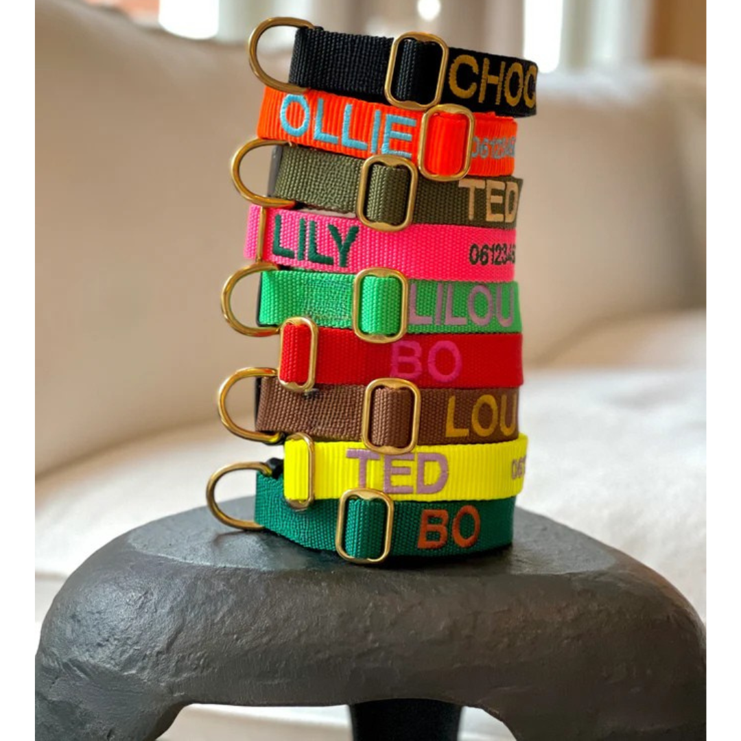 Give your dog a unique look with our personalized collars. Pick your favorite color and add a name or phone number for extra safety and style. Strong, comfortable, and made to order – designed especially for your dog.